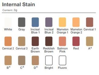 Using INTERNAL STAIN, it is possible to replicate many of the most intricate three dimensional patterns of shade variation found in natural teeth. IS FLUORO is added to the kit.