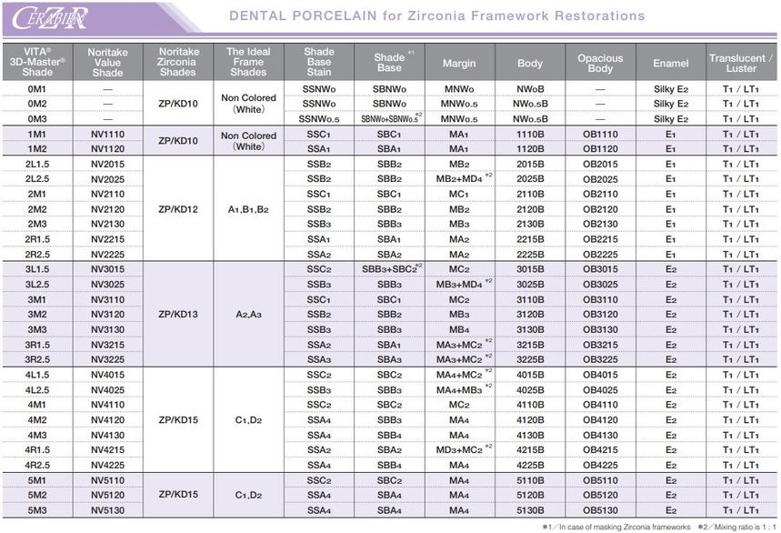 Noritake Value Shades are additional shades that expand the existing EX-3 and CZR selection of Body and Opacious Body porcelain powders to include the VITA® 3D-Master® shades. With the Noritake Value Shades you will discover a simple, quick and precise solution to completing VITA® 3D-Master® shade restorations.