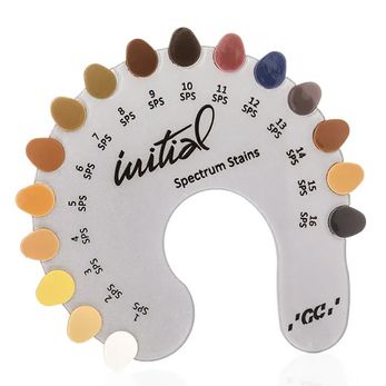 GC Initial Spectrum Stain is a universal stain and glaze system for the individualized staining and characterization of ceramic and monolithic materials. This product is a powder stain (paste stain liquid available), available in a variety of 16 colors. It is the latest extension to the GC Initial product portfolio.