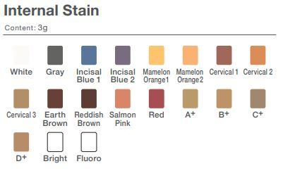 Developed in collaboration with the renowned ceramist Mr. Aoshima, INTERNAL STAIN makes the innovative "Internal Staining Technique" practical for everyday laboratory use. The internal staining technique is the best method to replicate many of the most intricate patterns of shade variation found in natural teeth. IS FLUORO is added to the kit.