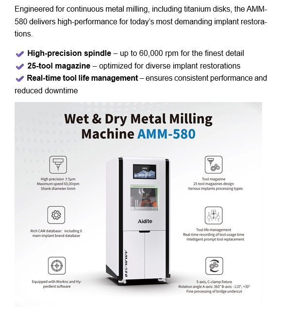 The AMM-580 is a highly versatile and robust milling machine designed to meet today's most demanding implant requirements. Suited for milling metal.