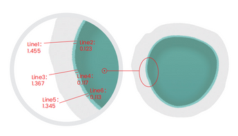 The cross-section diagram of the Biomic color opaque liquid applied to the dental crown. The green part represents the penetration depth.