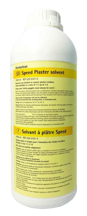Dentaclean Speed Plaster solvent is a ready-to-use solution used to remove residue, leaving no trace on all surfaces. This solvent gently removes plaster quickly and does not harm the acrylic surface or shade. Hard plaster is efficiently removed without any damage to the mixing bowl.