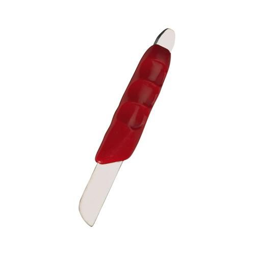 Long blade (6.5cm long edge). Stainless, with anatomically shaped plastic handle (red).