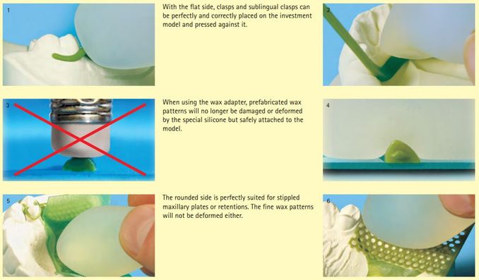 Quick and safe adapting of prefabricated wax patterns in the CoCr technique. With the flat side, clasps and sublingual clasps can be perfectly and correctly placed on the investment model and pressed against it. When using the wax adapter, prefabricated wax patterns will no longer be damaged or deformed by the special silicone but safely attached to the model. The rounded side is perfectly used for stippled maxillary plates or retentions. The fine wax patterns will not be deformed either. 1 piece