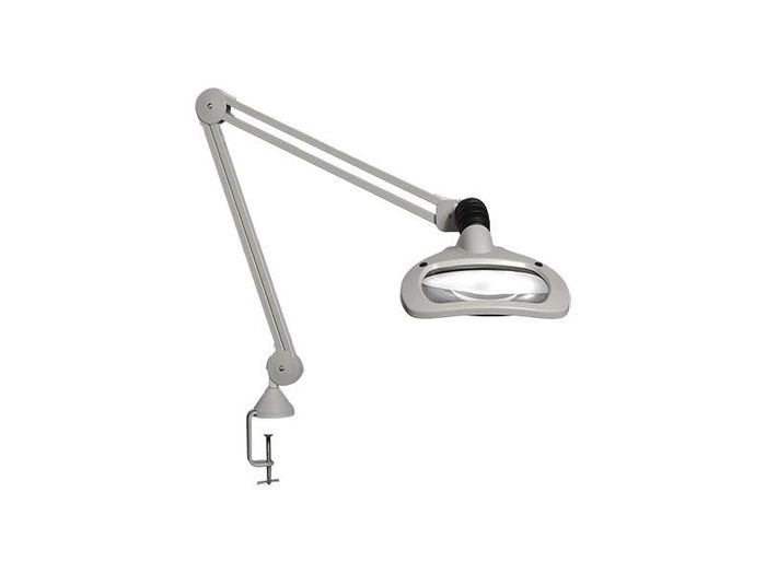 Steel arm, shade in aluminium. Standard with 3.5 dioptre (1.9x magnification) crown glass lens, 175x108mm. For additional magnification, a secondary 4D, 6D or 10D lens can be attached for 2.9x, 3.4x or 4.3x magnification respectively.