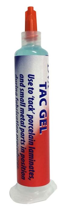 TacGel is used to hold veneers, crowns, and small castings in place during fabricating and finishing procedures. Its use greatly simplifies the handling of small, difficult-to-handle parts. TacGel, in effect, provides the technician or dentist with a 'third hand’ during production procedures.