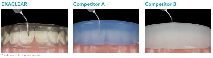 EXACLEAR is an innovative, clear silicone material that fulfils the needs of demanding aesthetic cases and facilitates consistent results. It’s absolute transparency offers total visual control making it ideal for creating outstanding aesthetic results in complex clinical situations.