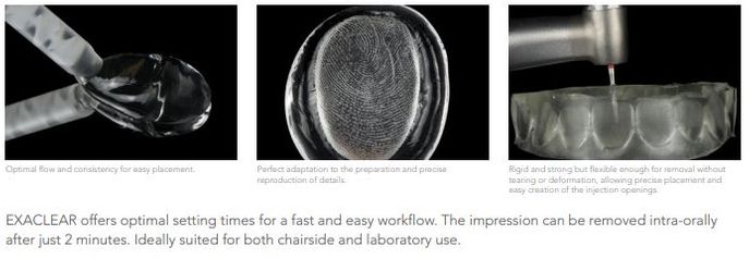 EXACLEAR offers the perfect balance of properties for ease of handling, staying in place when extruded by flowing nicely under pressure, resulting in perfect adaptation and reproduction of details.