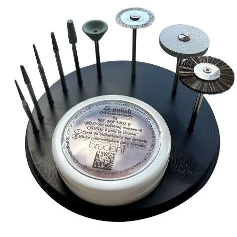Instruments and the polishing paste are arranged on a black resin blank, which is visually identical to a 98mm zirconia blank giving a you a pleasing aesthetic.The order numbers (REF) are engraved by laser, therefore good legibility