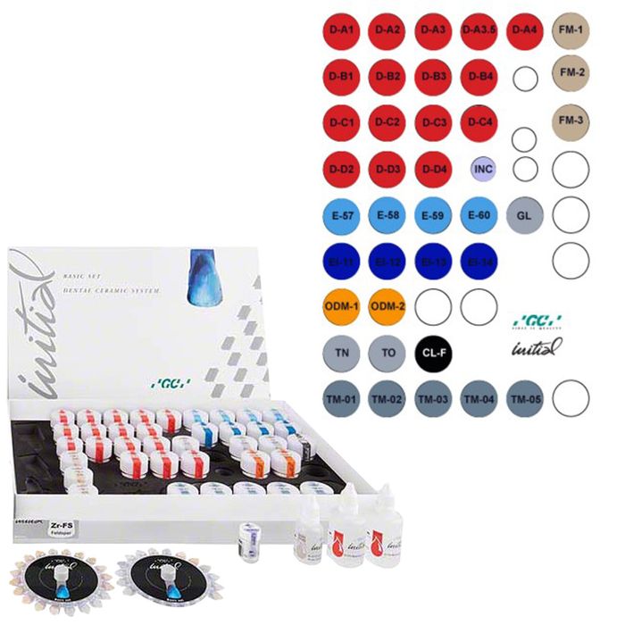 The Initial Zr Basic Set contains all the fundamental opaque ceramics, shade ceramics and liquids. Designed for basic, standard build-up and to meet the standard requirements of the Vitapan* Classical shade guide.