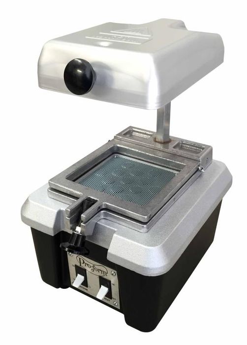 The Single Chambered Vacuum Former is an economical answer that can still excellently fabricate most thermo-plastic appliances. The all-aluminum construction eliminates rusting and the heating element is symmetrically engineered for uniform heat distribution. The hexagonal post keeps the frame from rotating or sliding. This vacuum former uses 5" x 5" (12.7 x 12.7 cm) resin sheets. Made in the USA.